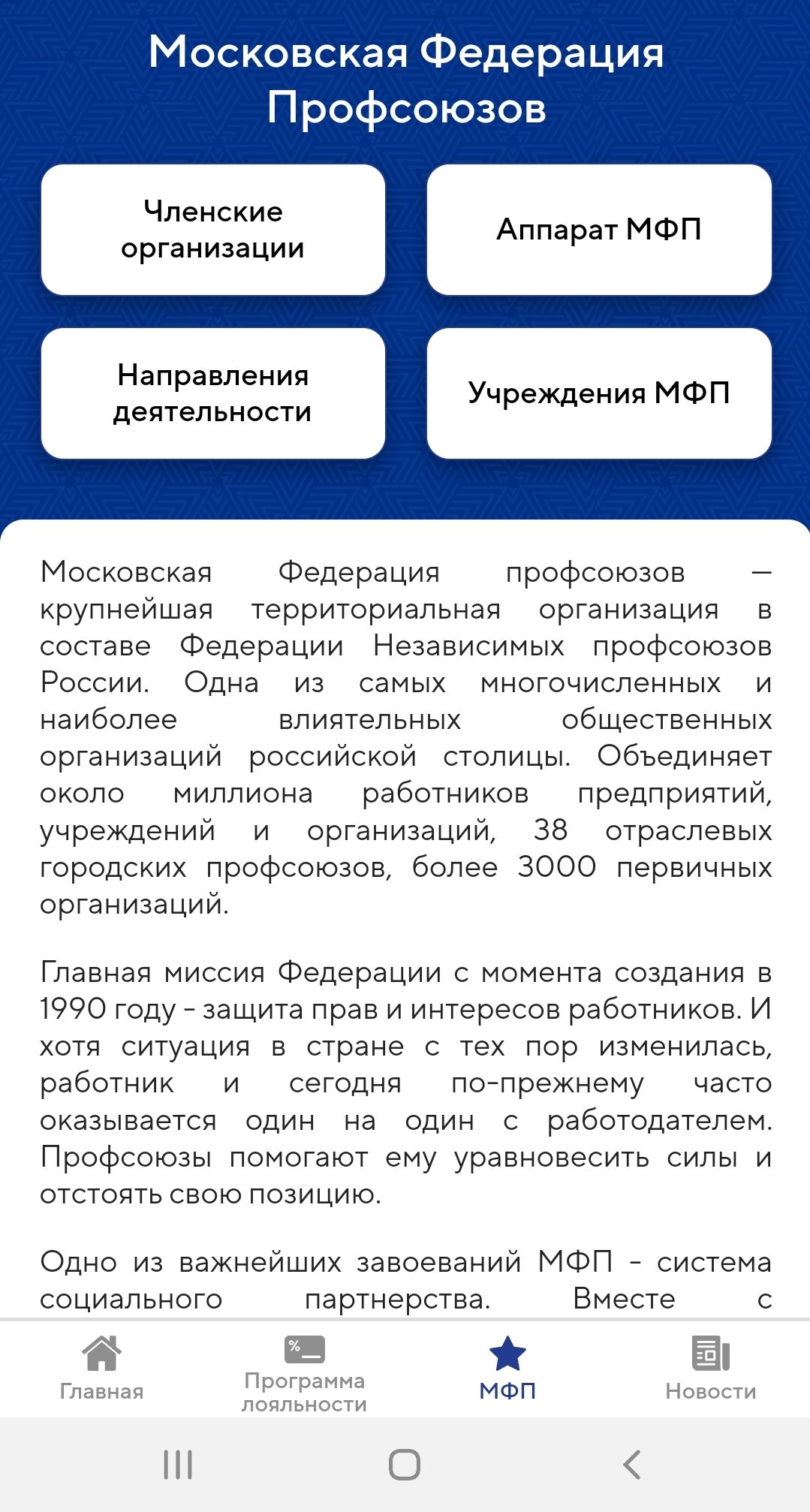 Для использования приложения «Мой профсоюз» не обязательна регистрация, что делает его удобным для тех, кто только заинтересовался профсоюзом. Человек может узнать больше о МФП, идеях и ценностях, профсоюзных новостях, анонсах и программе лояльности.