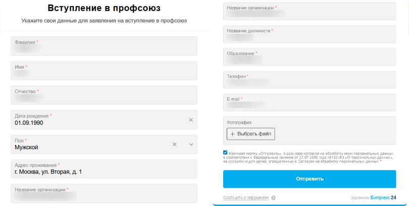 Иерархия профсоюза точно воссоздана в Битрикс24: каждый видит только свои зоны ответственности. Добавлено поле «Член / не член профсоюза» — основа для автоматизации помощи и рассылок. Доступ к данным строго контролируется.